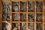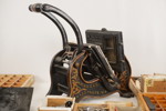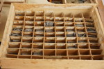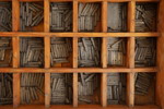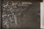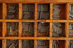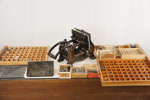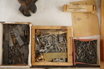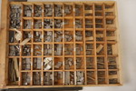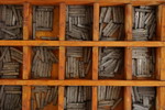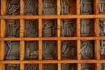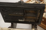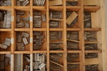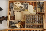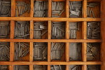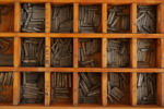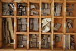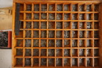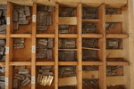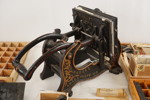 Tryckpress med lådor som innehåller bokstäver och typer för tryckning.