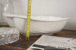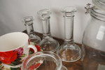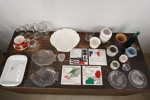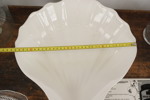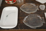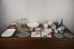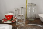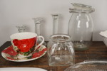 Glasskål med fiskdesign, porslinsform, glasljusstakar?, kopp och tallrick med rosdesign, koppar och vaser, glastallrickar.