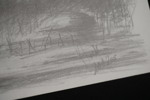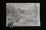 Tryck på en tavla gjord i blyerts, motiv på ett hus bland träd, framför berg, nära en å med en brygga som har en båt.