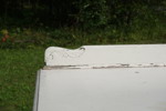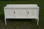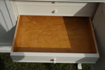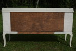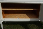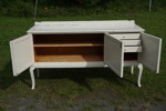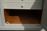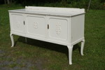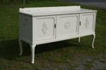 Sideboard har sprickor och flagor i färgen, vilket är ett naturligt resultat av dess ålder. Det bidrar till dess charm och autenticitet. Trots detta är strukturen stabil och bänken är i gott bruksskick.