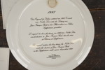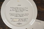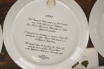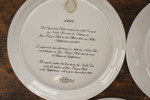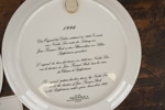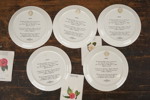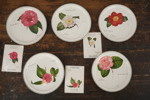 Tallrikar med olika sorters Kamelia blommor och texter. Camellia Bruccana 1998, Camellia Picturata Bianca 1995, Camellia Rubricanlis 1996, Camellia Jacicularis 1994, Variegata Resa 1997.