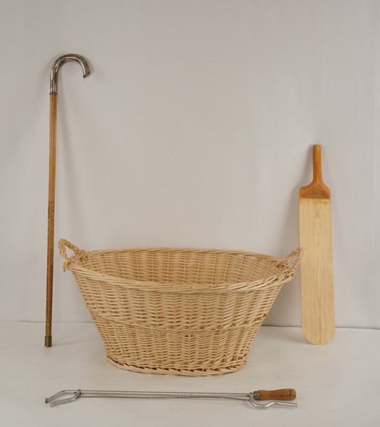 Korg i rotting, stav, brödbokspade, plocktång. B281