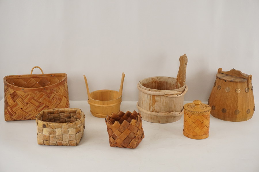 Diverse behållare i trä och korgar av trä eller bark. BC102