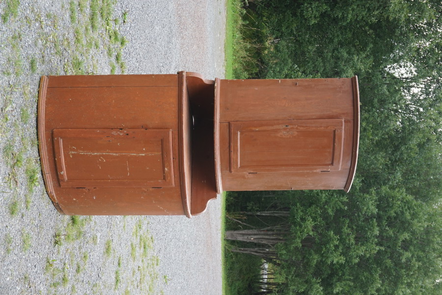 Hörnskåp Allmoge. Möbeln inkluderar en skyltdocka med musa. B210